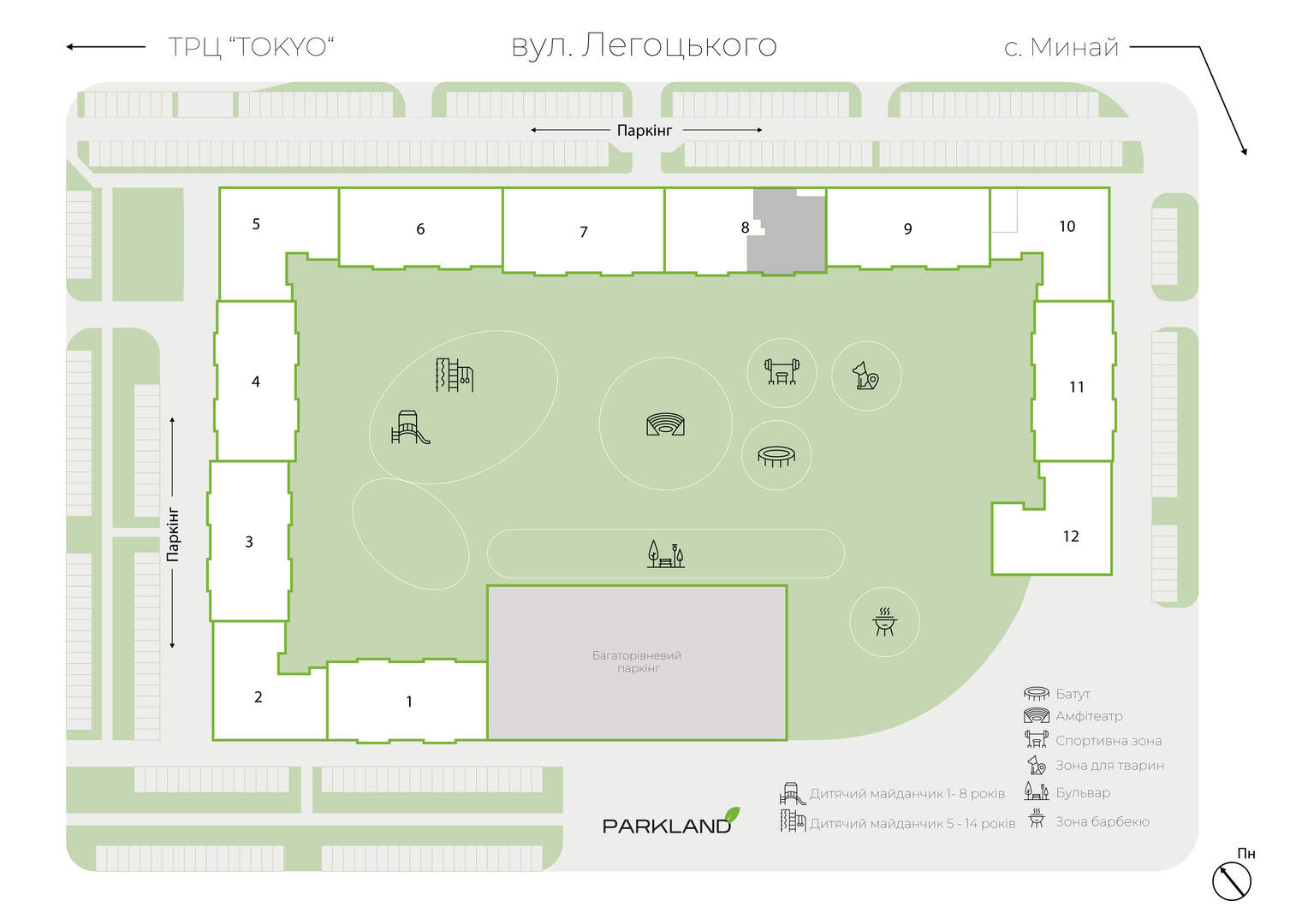 Park Land — це комплекс із 12 секцій по 9 поверхів кожна, що формує внутрішній двір без автівок. Безпечний простір для дітей і спокій мешканців — це не гасло, а частина продуманої архітектурної філософії проєкту.